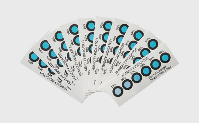 濕度指示卡主要用于半導體、線路板(PCB)、軍需品、光學儀器、醫藥、倉儲及其他包裝等。成品為可視卡片,卡片中每個圓點分別對應一個濕度值,隨著相對濕度的變化,圓點通常由藍色逐漸變成粉紅色(含鈷濕度卡),或者由棕色變成淺藍色(無鈷濕度卡),由此可以確定環境的相對濕度值,以幫確定干燥劑是否需要更換,濕度卡可根據客戶需求定制。可與鋁箔袋,干燥劑等配套使用。